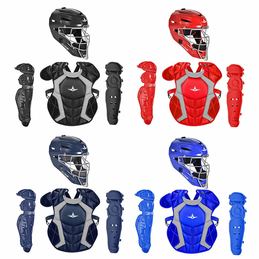 Hit the field in the all-new All-Star Pro League High School Catcher’s Kit NOCSAE Approved. The All-Star Classic Pro Catcher’s Kit includes the MVP 2400 solid gloss helmet, CPCC1618S7X chest protector (meets NOCSAE standard), and LG21WPRO classic leg guards, making it the ideal kit for players or teams on a budget.
