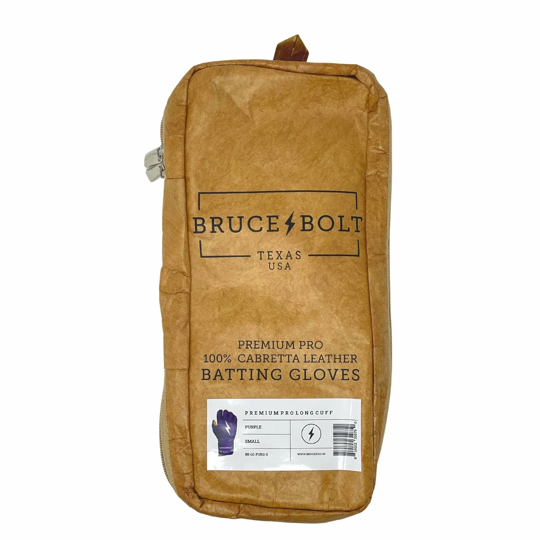 Each pair of Bruce Bolt Premium Pro Long Cuff PURPLE Batting Gloves are handmade by skilled craftsmen using only the highest quality 0.9mm Cabretta leather and stitching techniques which makes Bruce Bolt gloves buttery soft but more durable than any other glove on the market.