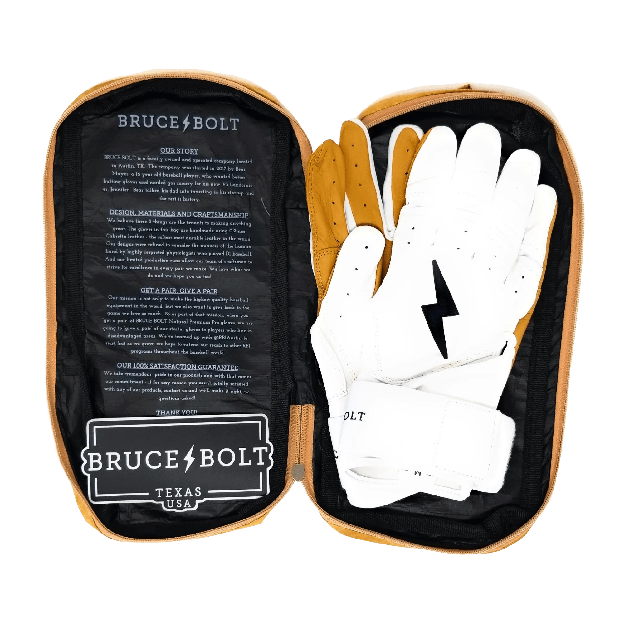 BRUCE BOLT is the newest name in baseball. Their White Premium Pro Long Cuff batting gloves are some of the highest quality, best fitting, most durable gloves in the game. They’re made from the ultra premium 0.9mm Cabretta leather and feature a proprietary Double Inverse Cuff System which creates a more powerful swing and unmatched wrist support at the point of contact. Each pair of BRUCE+BOLT gloves are handmade by highly skilled craftsmen. It’s unlike any other glove out there.